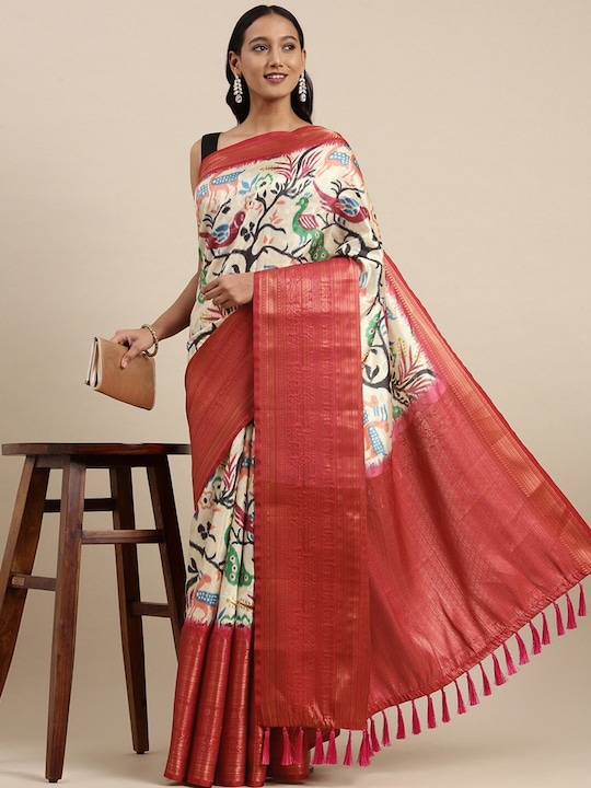 White and red Pure Silk Kalamkari Zari Banarasi Saree