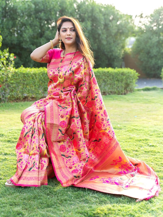 Gold-Toned & Pink Floral Zari Banarasi Saree