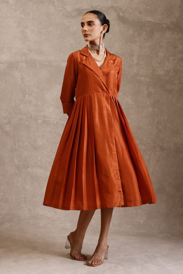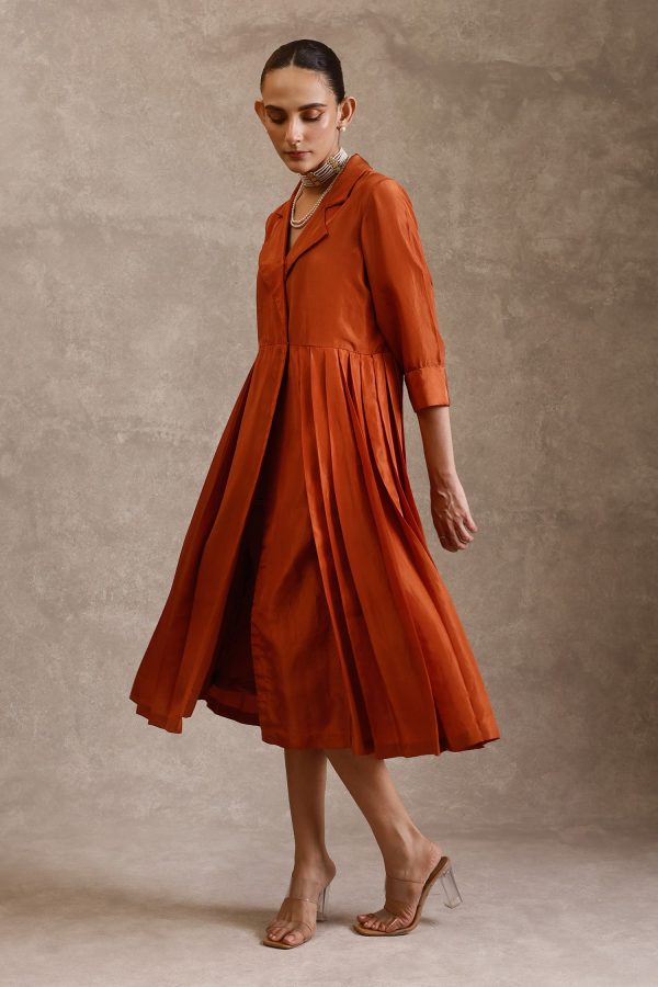 Orange Handwoven Silk Lapel Chaya Pleated Dress