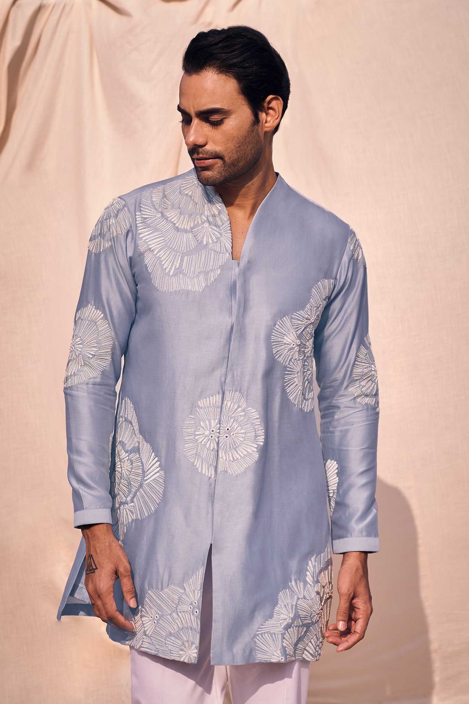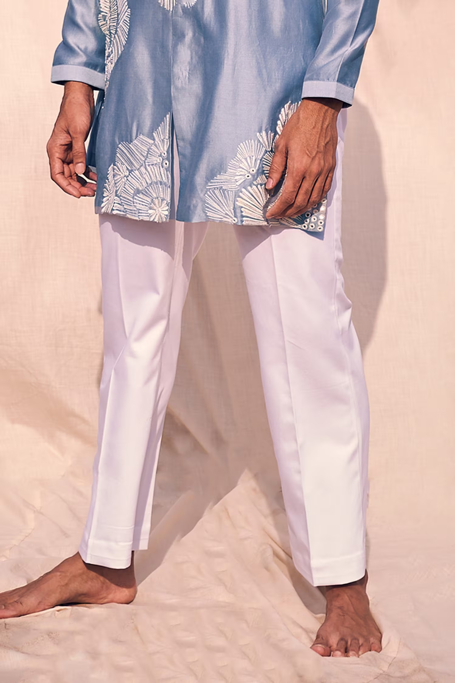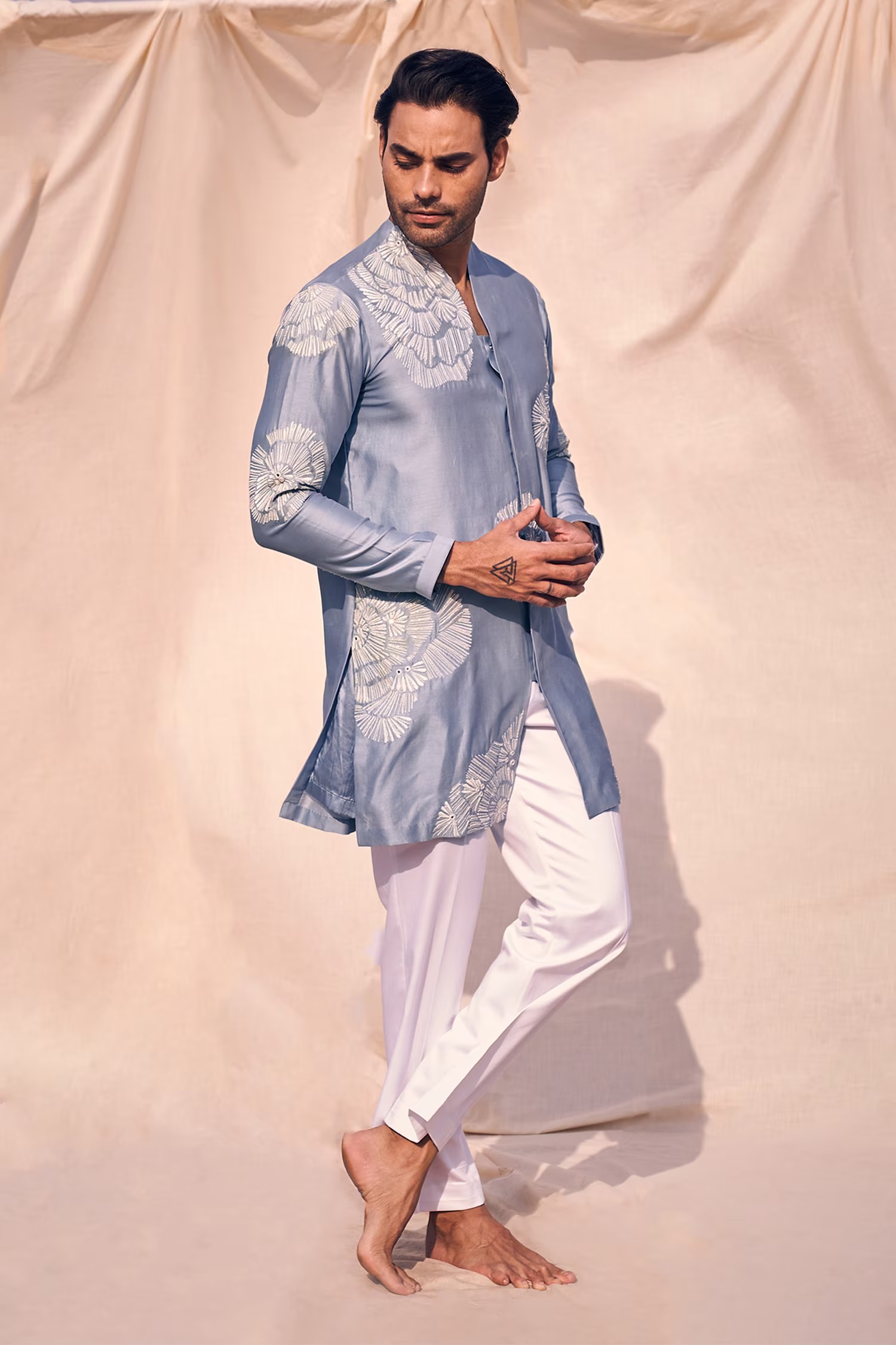 Blue front open kurta with thread, cutdana embroidery in geometric pattern. Paired with white pant.