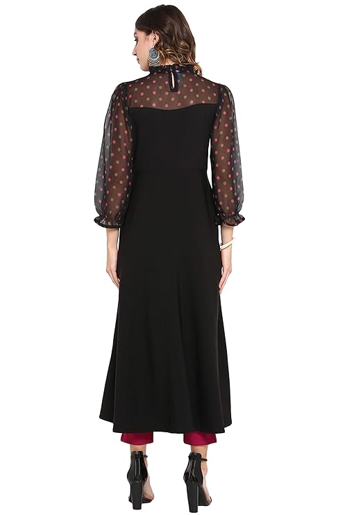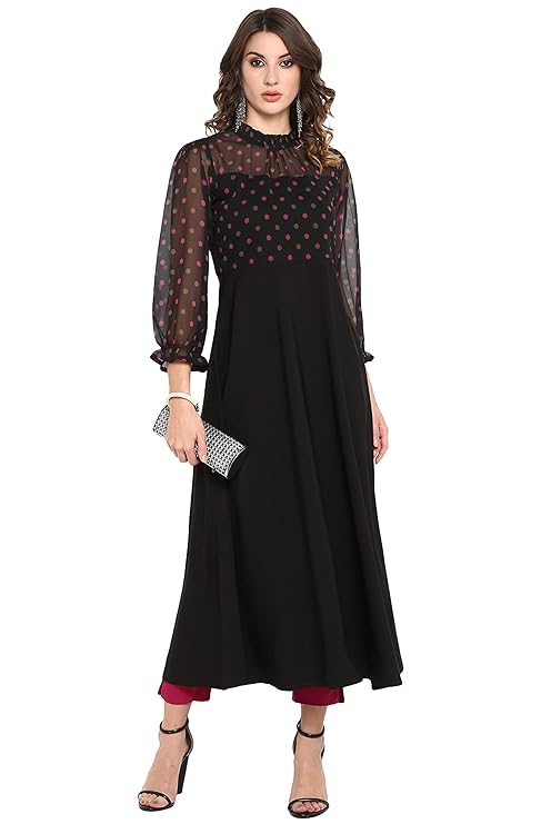 Style:- Length: 52(inch) | Pattern: Polka Print | Occasion: Casual | Type: A-line | Sleeve Type: Full Regular Sleeves | Color: Black